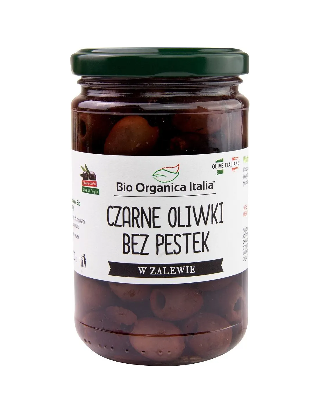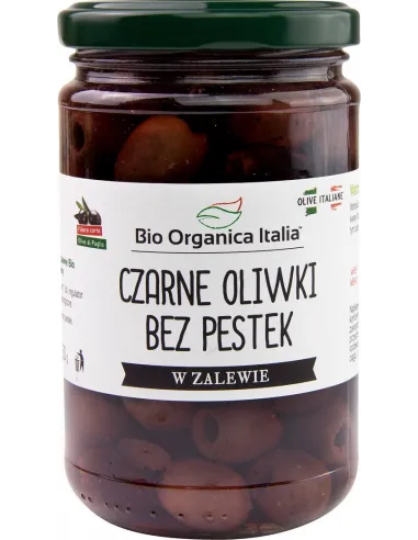 Czarne oliwki bez pestek w solance firmy BioOrganicaItalia.