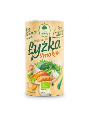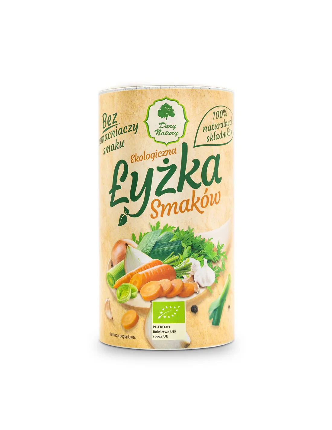 Łyżka smaków to specjalnie skomponowana mieszanka warzyw ekologicznych, która doskonale sprawdzi się w różnego rodzaju potrawach. Nadaje się jako dodatek zarówno w zupach, sosach jak i w daniach na gorąco z mięs, warzyw i ryb, a także w potrawach na zimno, w sałatkach czy pastach. Mieszanka podkreśli smak i aromat przygotowywanych potraw. Dzięki odpowiedniemu procesowi suszenia, składniki użyte do produkcji zachowują cenne wartości odżywcze oraz walory smakowe.