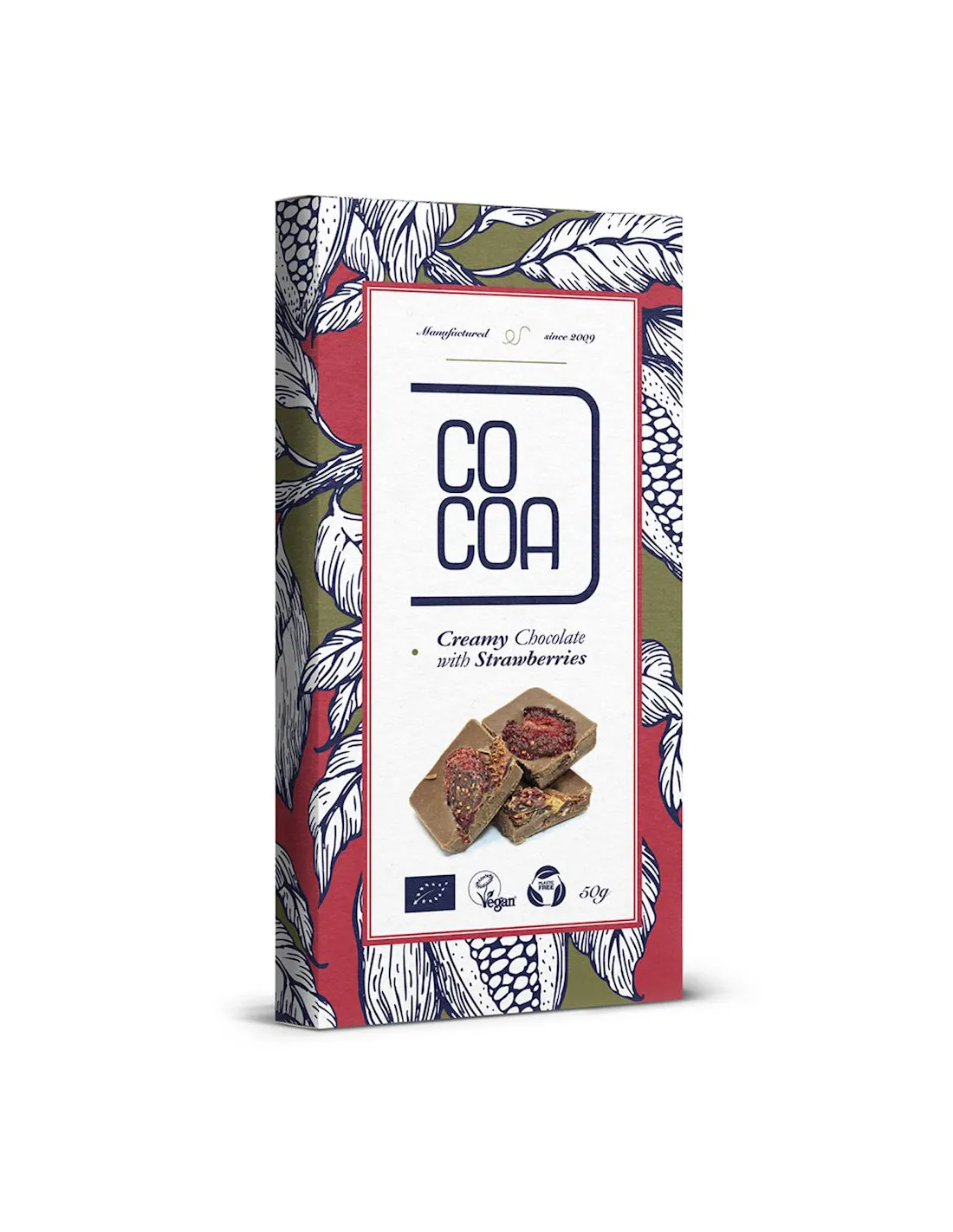 Wegańska surowa czekolada firmy COCOA o kremowej konsystencji z truskawkami.