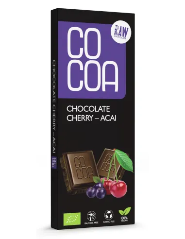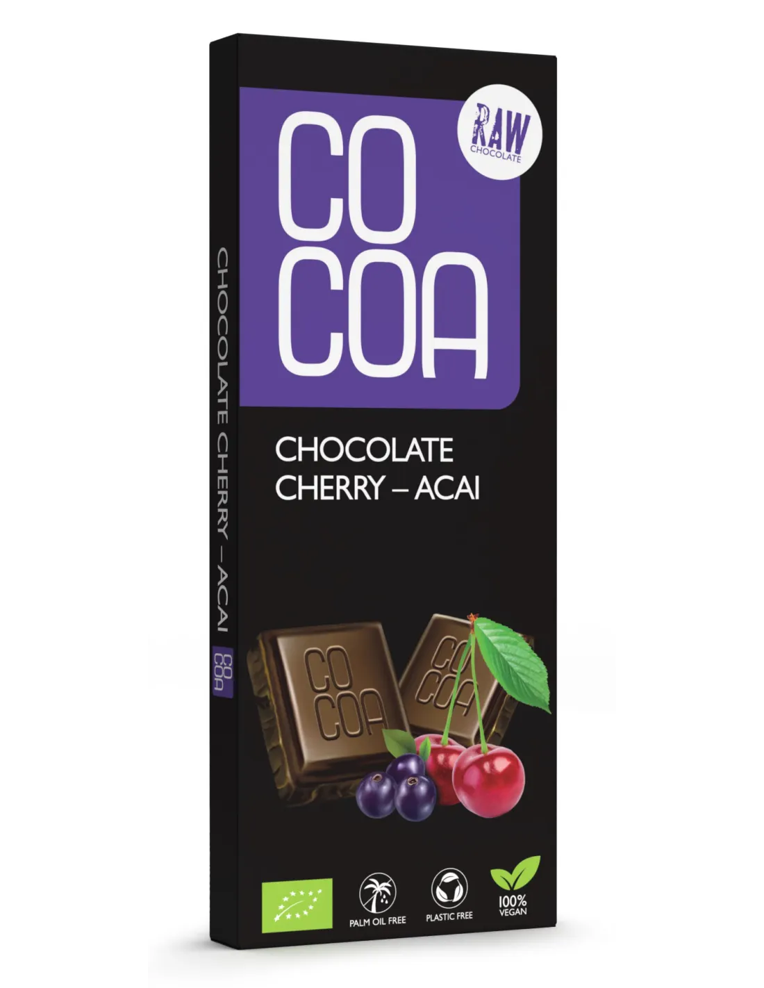 Wegańska surowa czekolada firmy COCOA o zawartości min. 60% masy kakaowej z dodatkiem wiśni, jagody czarnej i Acai.